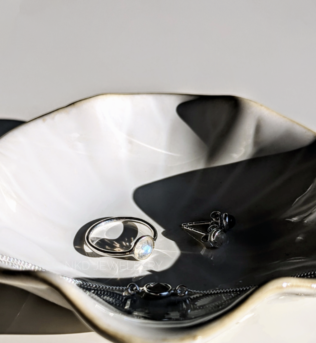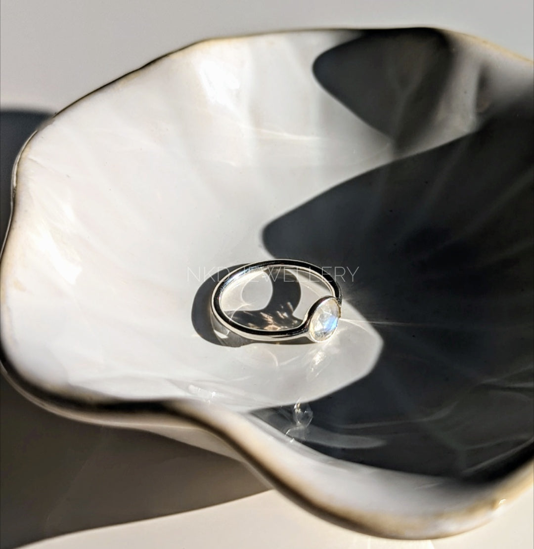 This beautiful dainty Rainbow Moonstone ring in 925 Sterling Silver is a statement piece to add more glamour and elegance to your style. Its small and dainty Rainbow Moonstone gemstone shimmers and glistens in the light adding extra sparkle to your day. Its multifaceted stone surface captures and reflects the light at every angle, maximising the gemstone's true beauty and elegance. Beautiful hints of blue when any form of light or natural light illuminates the stone. This lightweight and dainty ring is perfect for all skin types as it is hypoallergenic and suitable for sensitive skin.