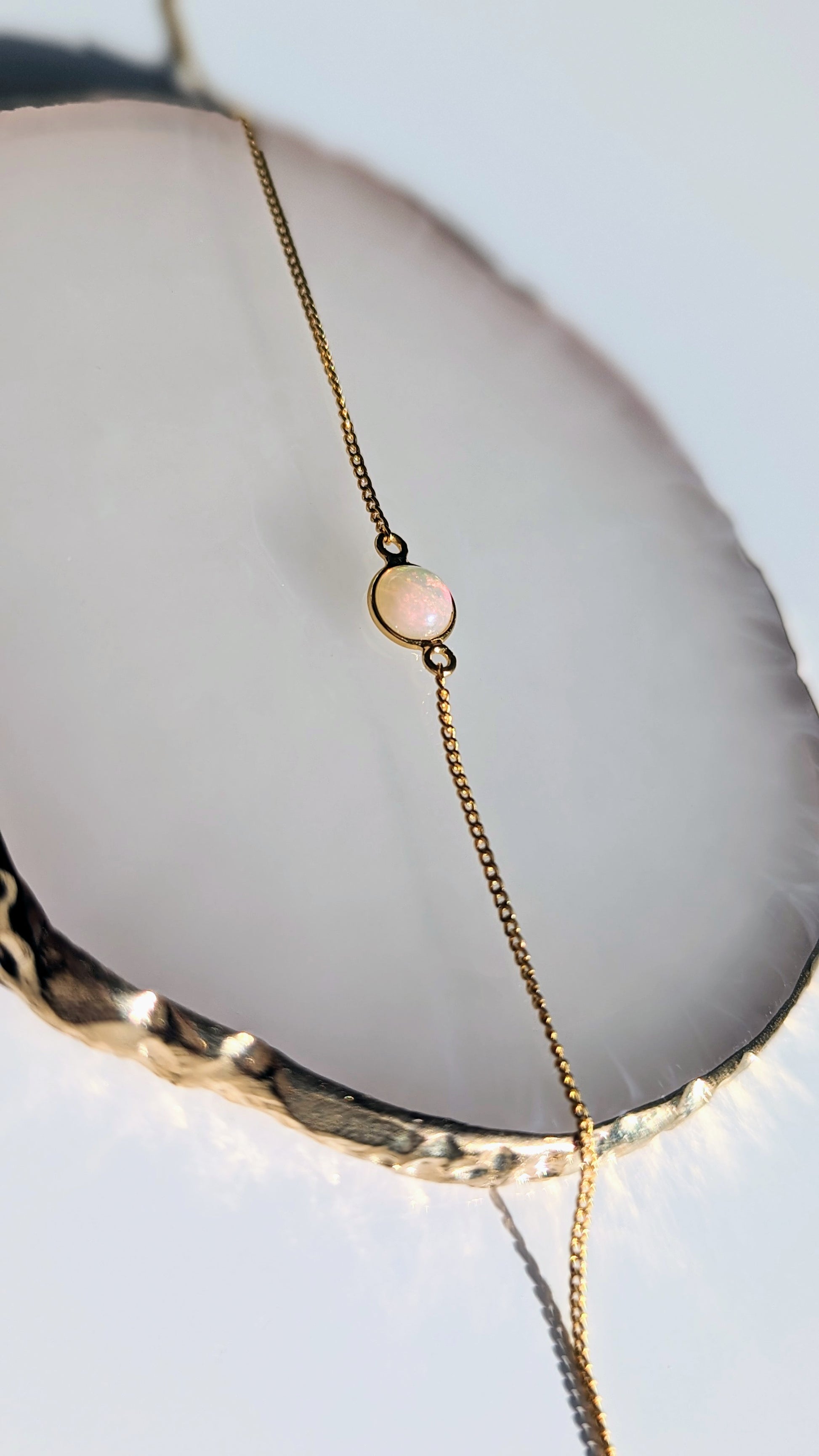 This stylish Ethiopian Opal Chain Bracelet in 18 ct Gold Vermeil is a magical piece to wear on any occasion and the epitome of elegance and beauty. Its round stone surface captures and reflects the light and different hues of decadent colour at every angle, maximising the gemstone's luxury and perfection.