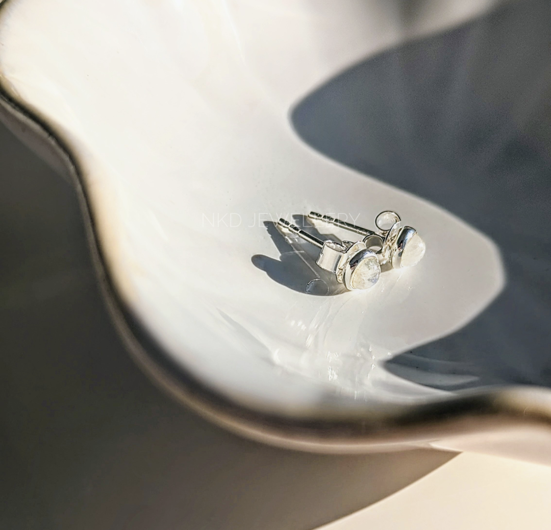 These beautiful Rainbow Moonstone Round Stud Earrings in 925 Sterling Silver are cute and minimalistic yet eye-catching pair of earrings which sparkle. Its multifaceted stone surface captures and reflects the light at every angle, maximising the gemstone's true beauty and elegance. Beautiful hints of blue when any form of light or natural light illuminates the stone. These lightweight and dainty earrings are perfect for all skin types as it is hypoallergenic and suitable for sensitive skin.