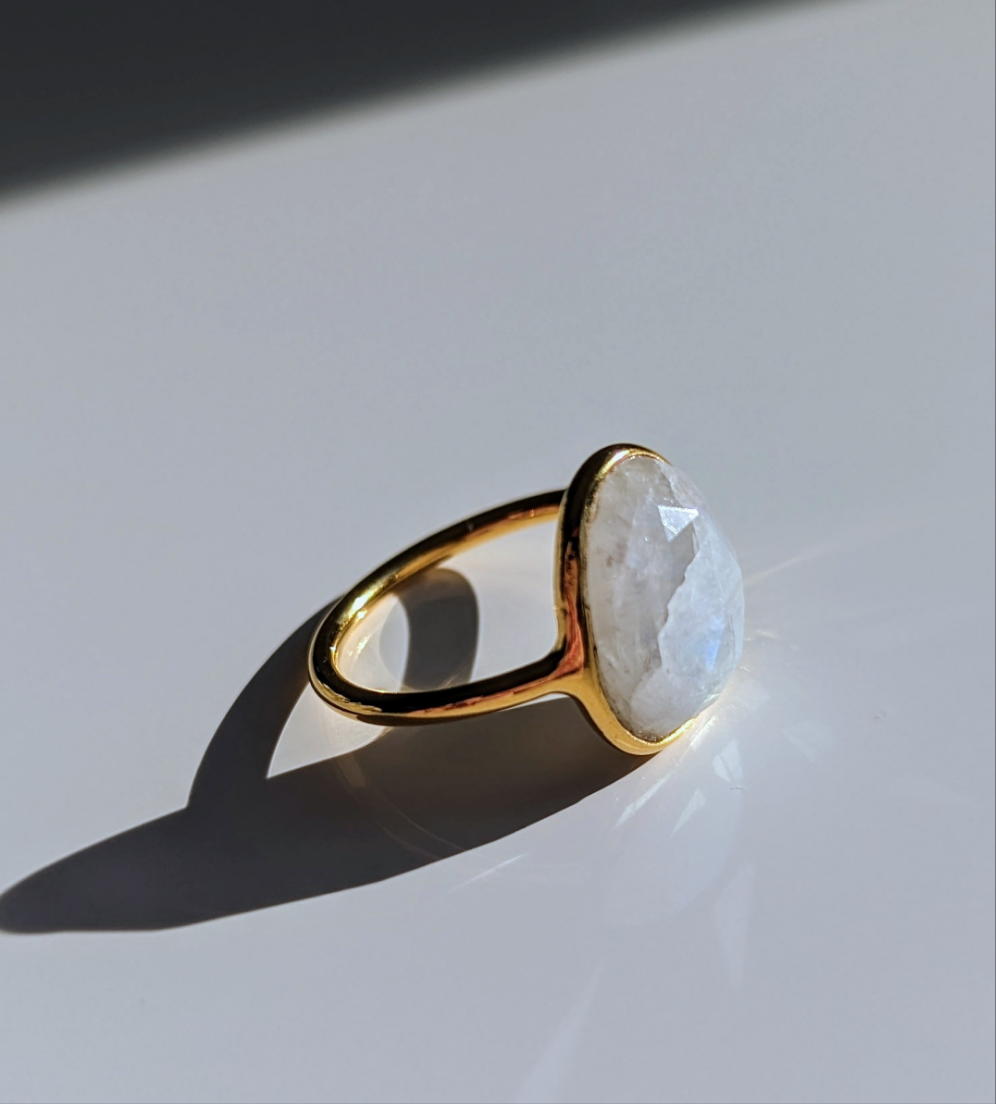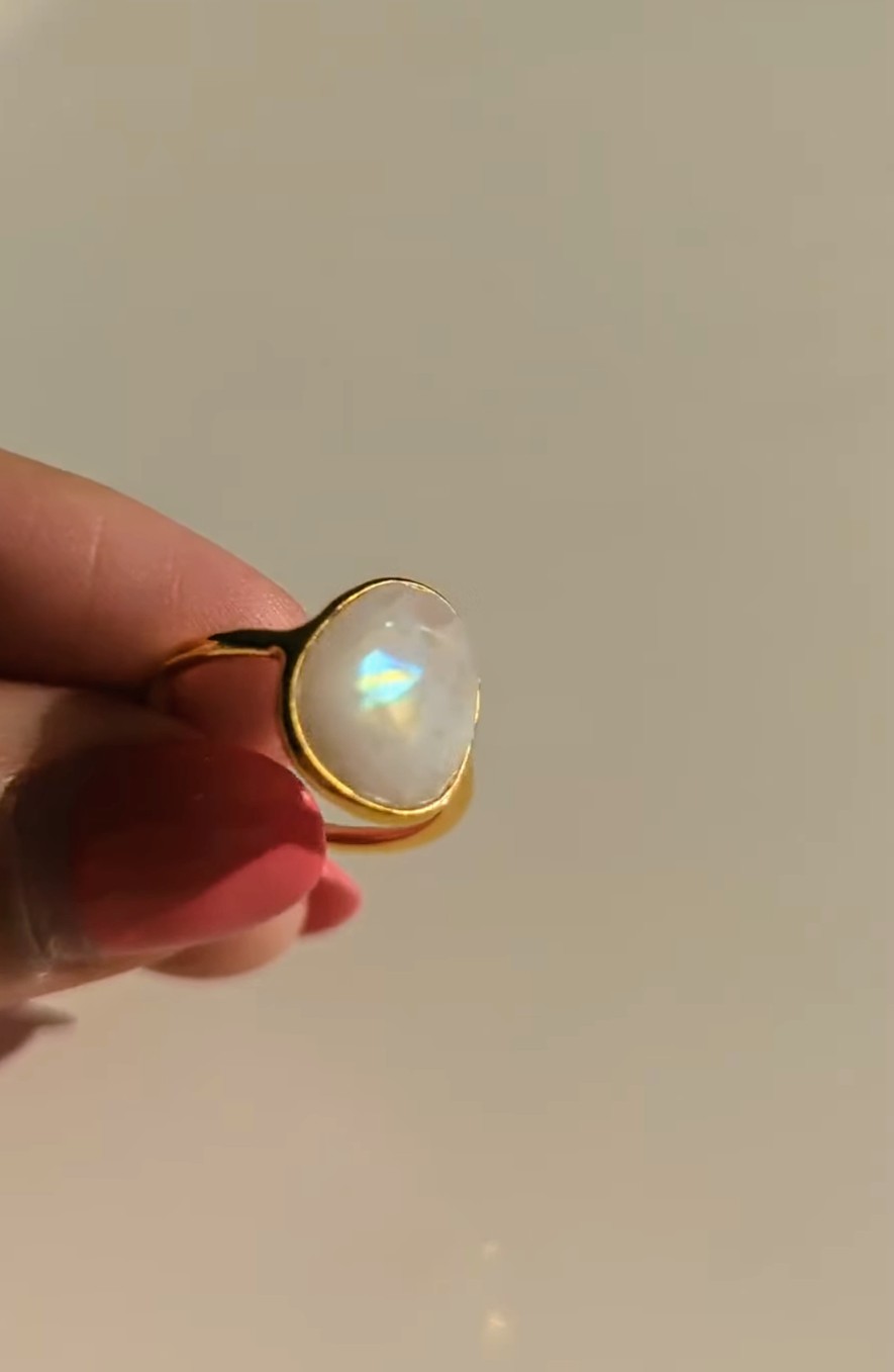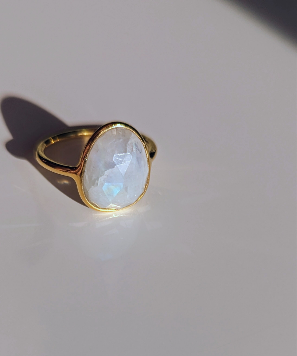 This beautiful Large Rainbow Moonstone Ring in 18 ct Gold Vermeil is definitely a statement piece to add more glamour and elegance to your style. Its large Rainbow Moonstone stone shimmers and glistens in the light adding extra sparkle to your day.