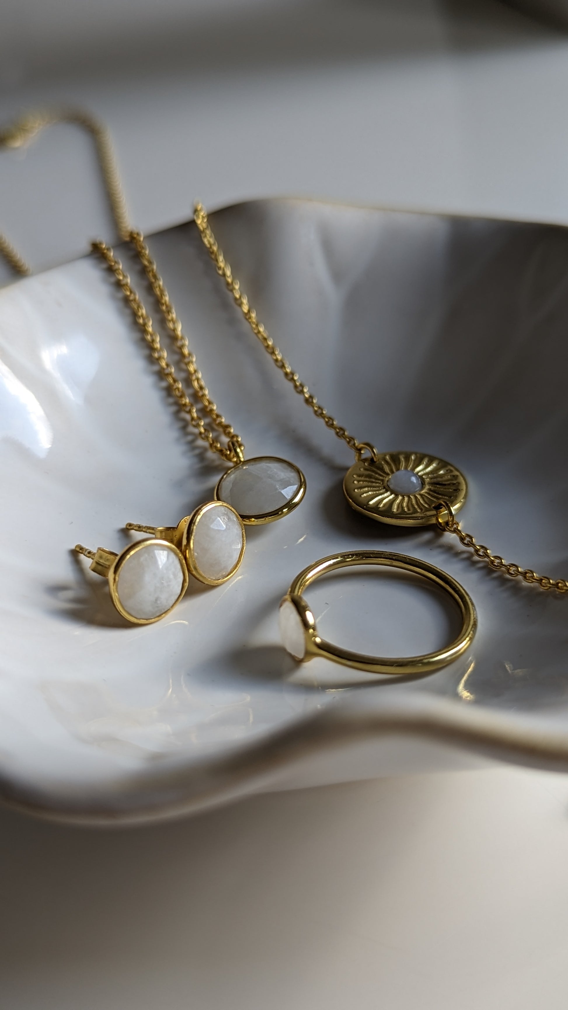 These beautiful Rainbow Moonstone Stud Earrings in 18 ct Gold Vermeil are a simple and minimalistic yet eye-catching pair of earrings which really do sparkle and dazzle. Its multifaceted stone surface captures and reflects the light at every angle, maximising the gemstone's true beauty and elegance.